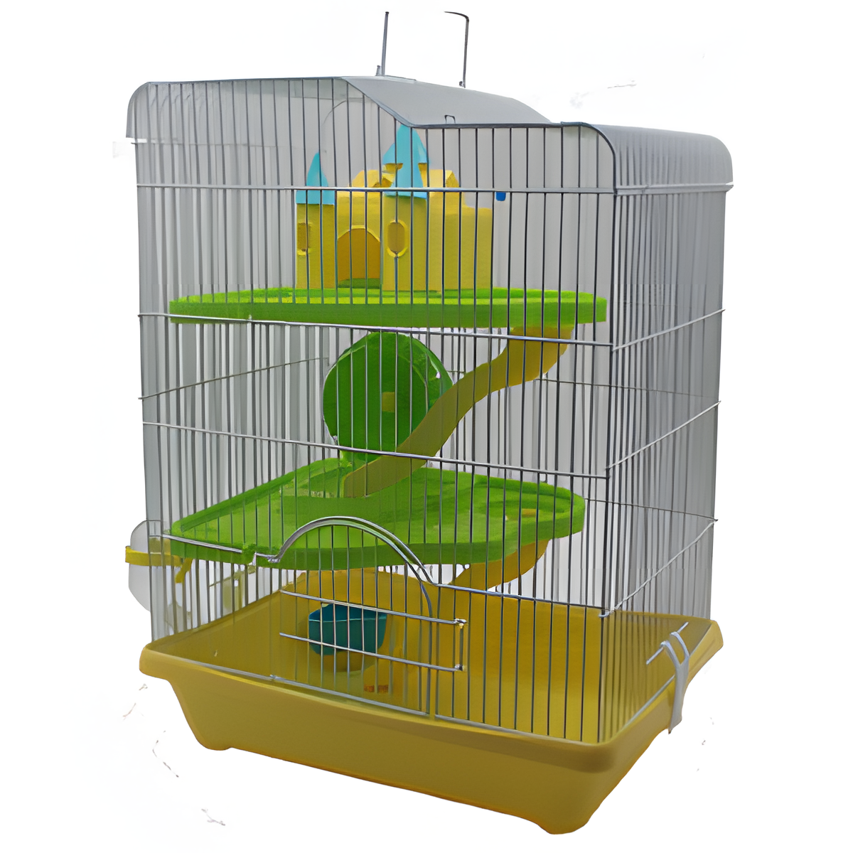 Jaula especialmente para hamster, contiene bebedero, comedero, rueda, rodadero y casita para que el rodeor pueda estar totalmente entretenido. Esta hecha de rejillas y tiene una bandeja plastica para que su limpieza sea mas sencilla.