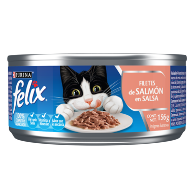 Purina® Felix® Filetes de Salmón es un alimento húmedo, con tiernos trocitos de salmón bañados en la cantidad exacta de una deliciosa salsa que le darán un sabor irresistible. Tu gato hará cualquier travesura para conseguirlo.