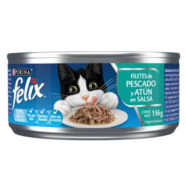 Purina® Felix® Filetes de Pescado y Atún es una deliciosa combinación de mar en unos jugositos filetes que harán que tu gatito haga las cosas más astutas para que se lo des todos los días.