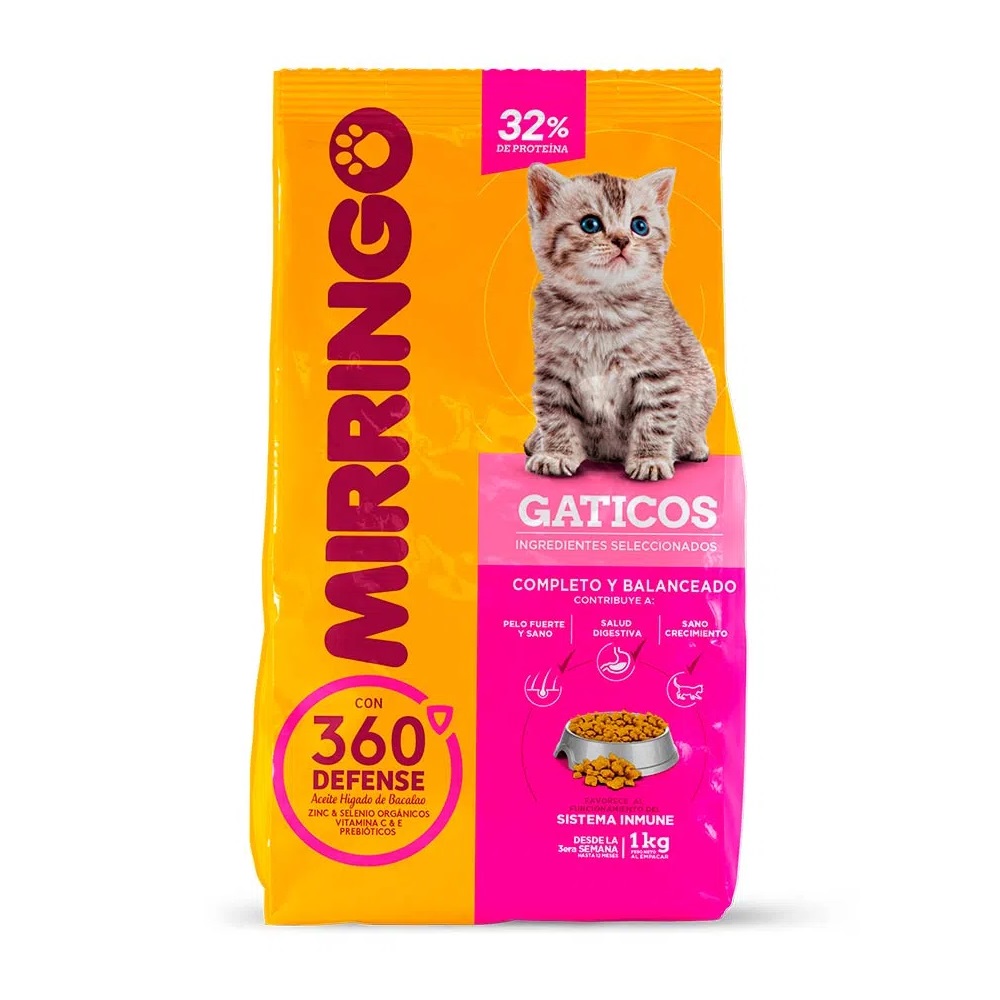 ¡Los más pequeños de la casa merecen lo mejor! Mirringo Gaticos 360 Defense es un alimento completo y balanceado que ayuda al sistema inmune de tu gatico y a fortalecer su desarrollo óseo y muscular. Entre sus ingredientes, contamos con un 32% de proteína de pollo, carne o pescado, que son una gran fuente de alimento para tu mirringo, manteniéndolo con vitalidad y energía. Además, para favorecer su desarrollo y aprendizaje incluimos Aceite de hígado de bacalao, prebióticos, vitaminas C y E.